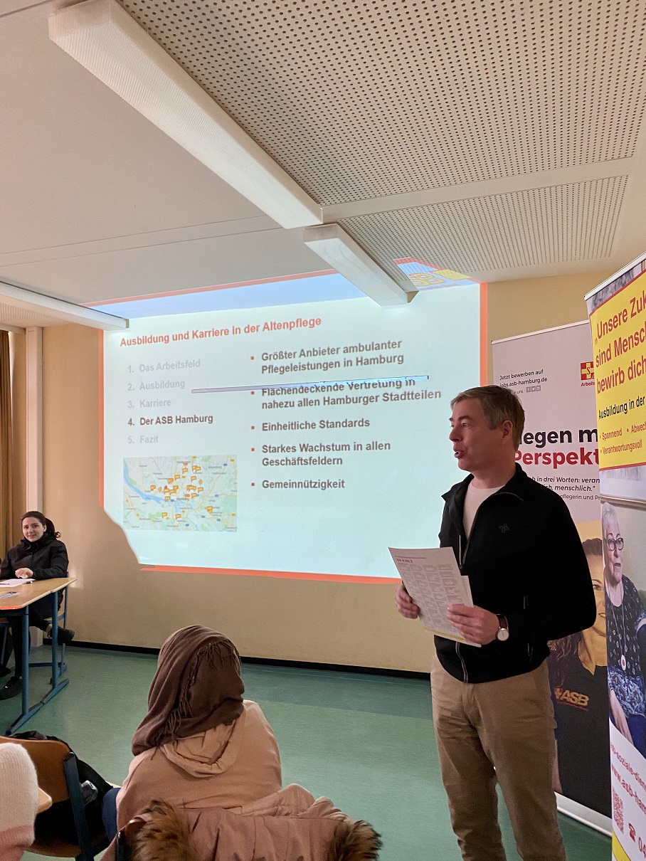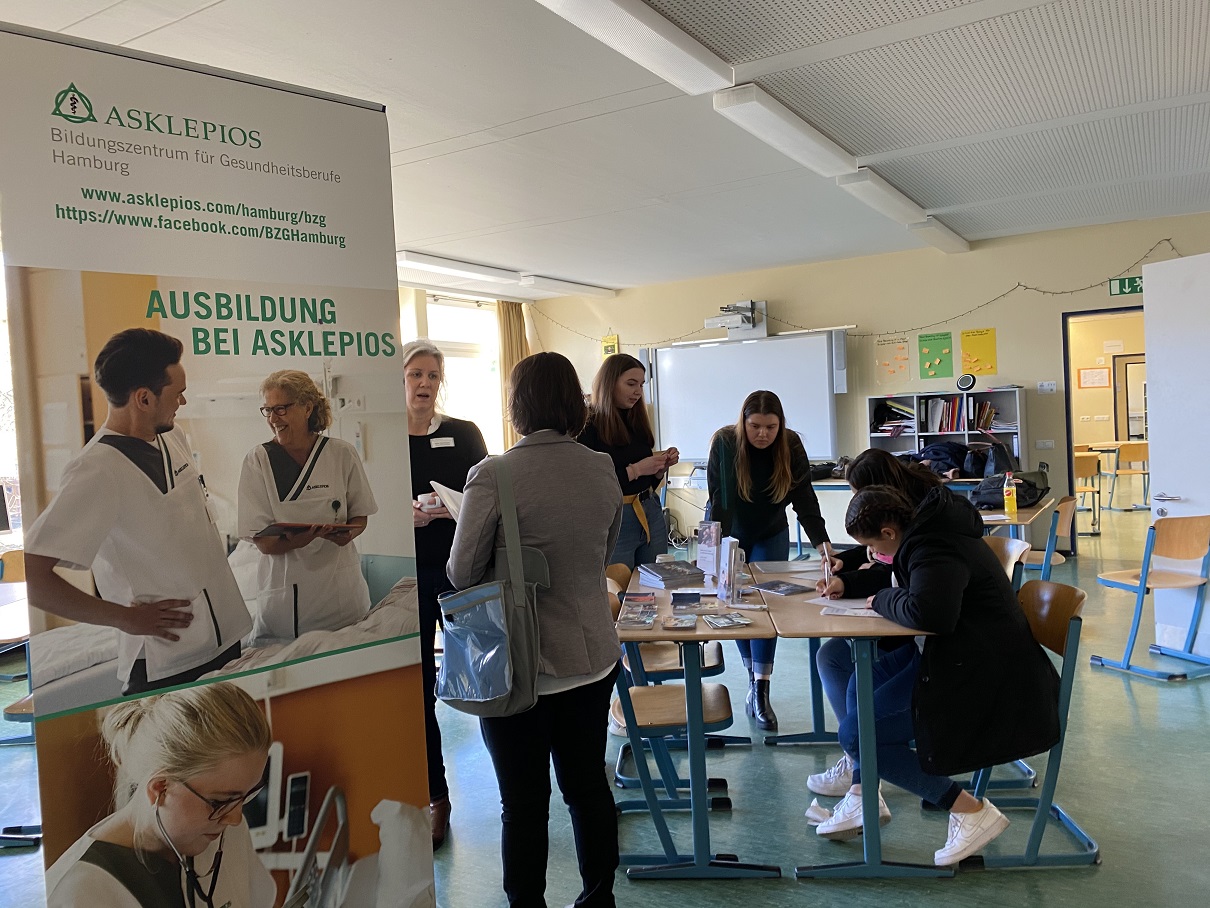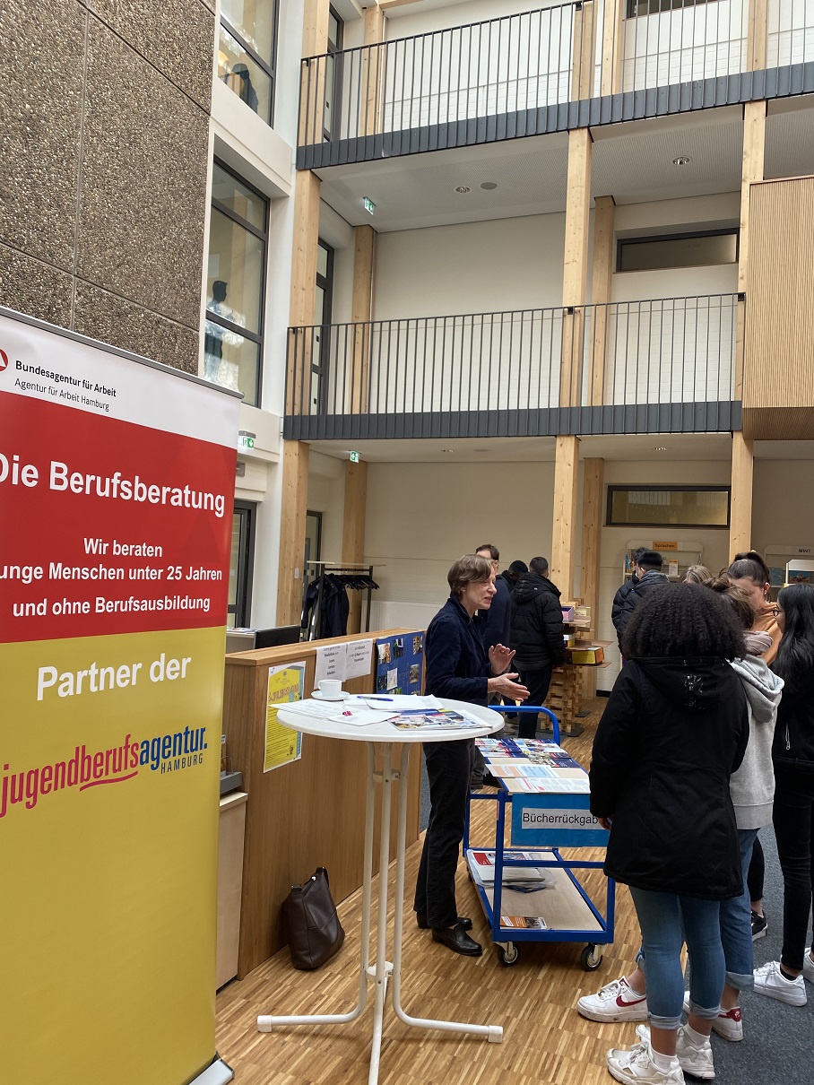 Wie schon im vergangenen Jahr war es für die Schülerinnen und Schüler möglich, sich über bestimmte Unternehmen und Ausbildungsmöglichkeiten zu informieren und sich ggf. zu bewerben. Eine sehr gute Ergänzung zu den beteiligten Unternehmen bildeten wieder die Jugendberufsagentur und das Hamburger Instituts für berufliche Bildung, mit den Themen Ausbildungsplatzsuche und Berufsfachschulen. Das Interesse an diesen Themen war sehr groß.