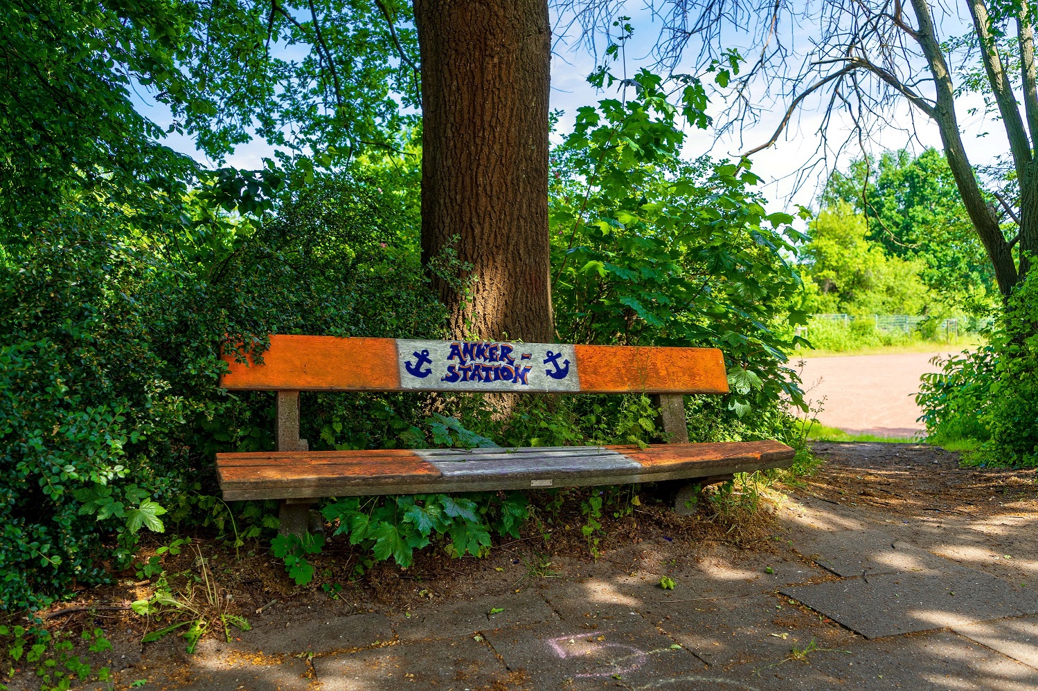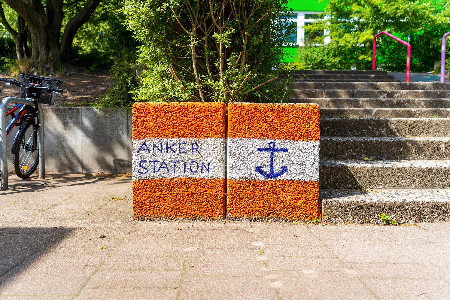Diese Ankerstationen sind auf dem ganzen Schulhof verteilt und sollen dem aufsichtsführenden / der aufsichtführenden KollegInnen als Treffpunkt dienen. Wenn Schülerinnen und Schüler ein dringendes Anliegen haben (bei klärenden Streitereien o.Ä.) können sie sich zu diesen besagten Stationen hinstellen, da diese garantieren, dass eine aufsichtsführende Lehrkraft dort vorbeikommt. Die Idee für diese Stationen existiert schon länger. Bislang fehlten jedoch die Ankerstationen, die auf der PJK im November von einer Gruppe festgelegt wurde. Frau Rüdiger übernahm den Auftrag, die Ankerstationen zu gestalten, wobei die Stationen von weitem sichtbar sein und über den ganzen Schulhof einen Wiedererkennungsfaktor haben sollten. So kommt es, dass die Gestaltung nicht kreativer und vielseitiger ausgefallen ist. Ursprünglich sollten die Stationen gemeinsam mit einem Kunstkurs gestaltet werden. Nach der PJK kam über den Winter erst einmal die Schlechtwetterphase, in der draußen die Farbe nicht gut getrocknet wäre, – und dann kam Corona. So wurde in der Corona-Phase das gute Wetter und die durch Nichtanwesenheit tobender Schüler geschützte Trocknungszeit genutzt, um die Ankerstationen zu bemalen. So sind über vier Tage verteilt die sieben Ankerstationen auf dem Schulhof entstanden.