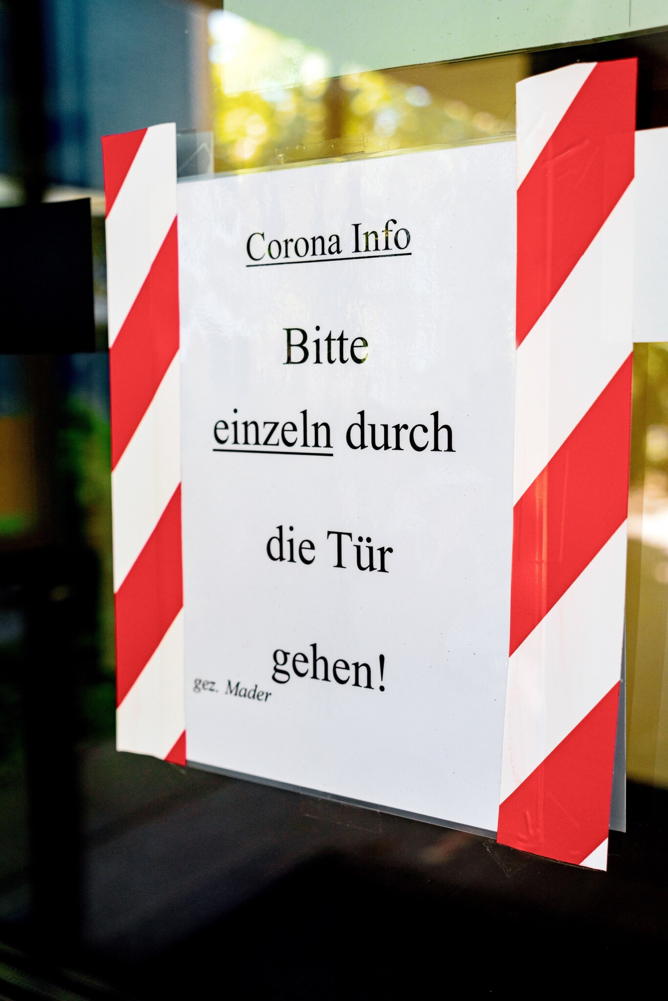 Diverse Schilder wurden an den Gebäuden angebracht, damit die Schülerinnen und Schüler die Sicherheitsmaßnahmen richtig befolgen können.
