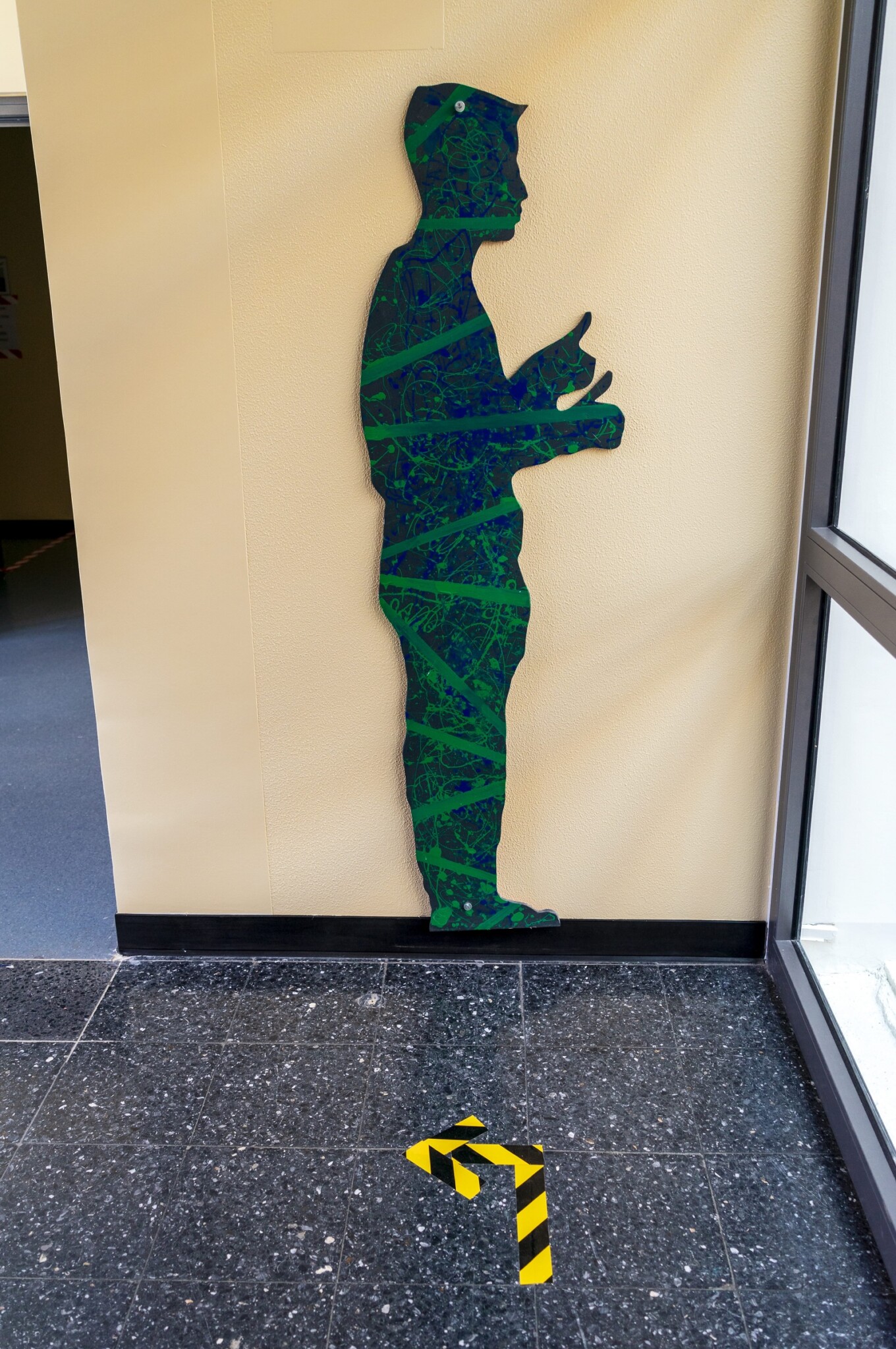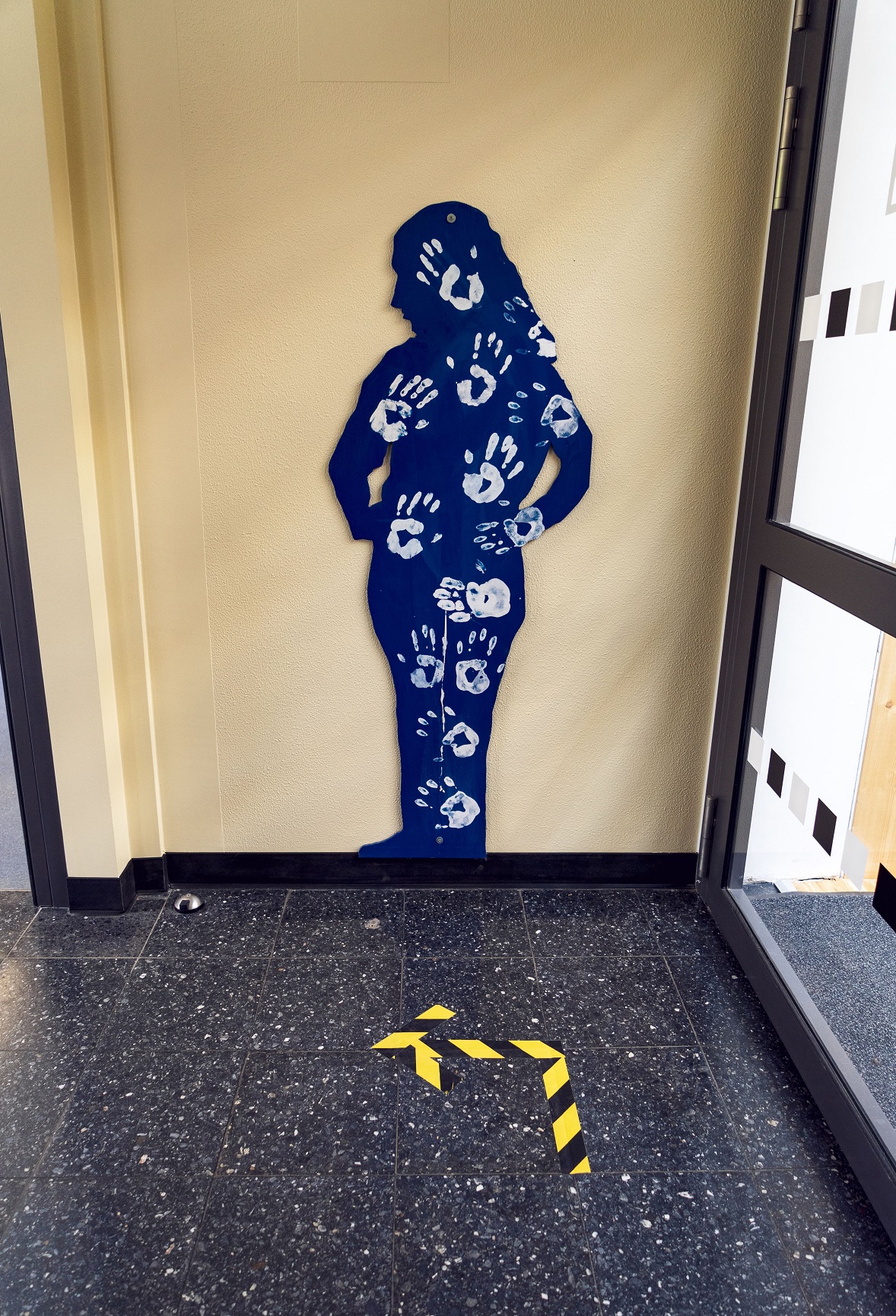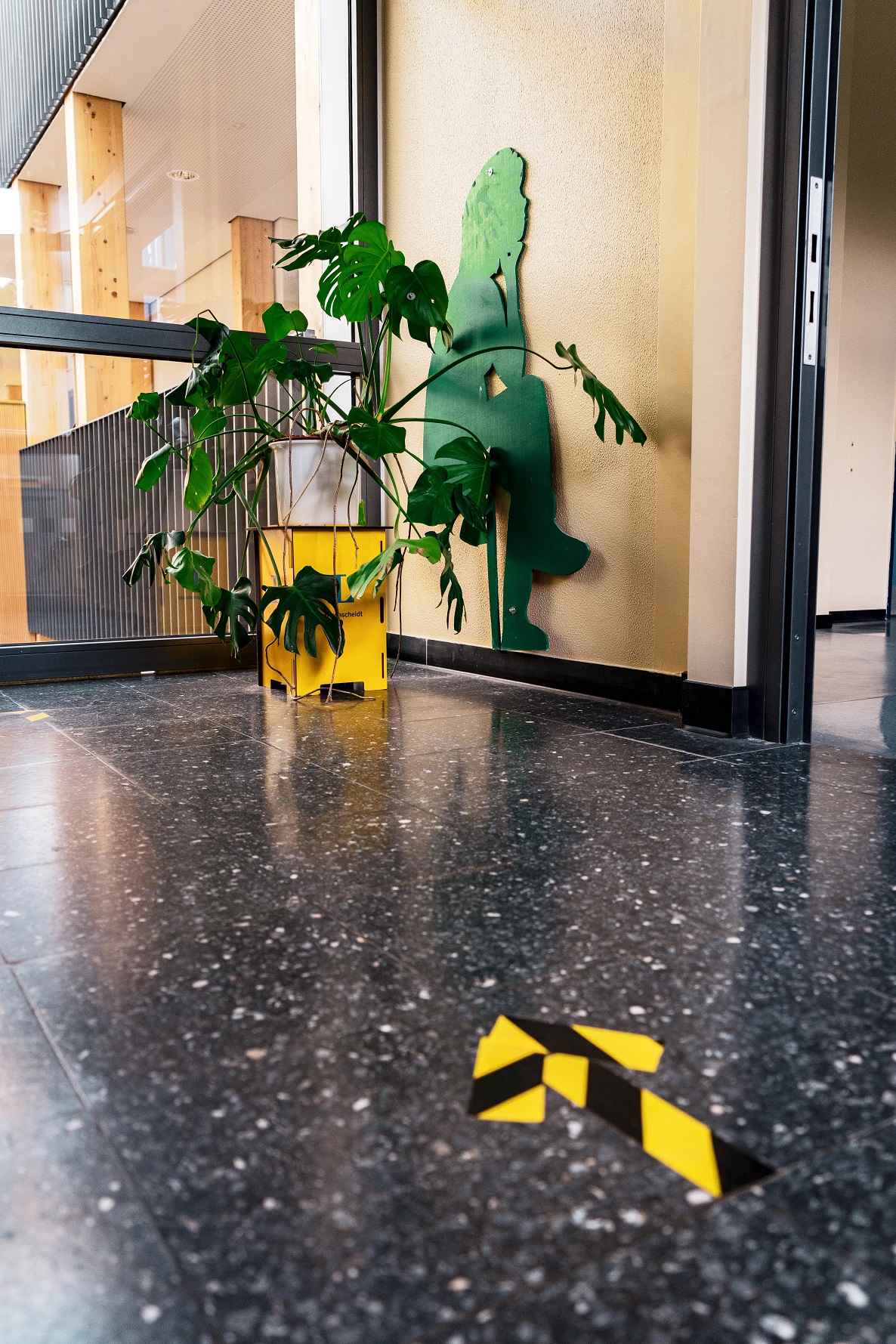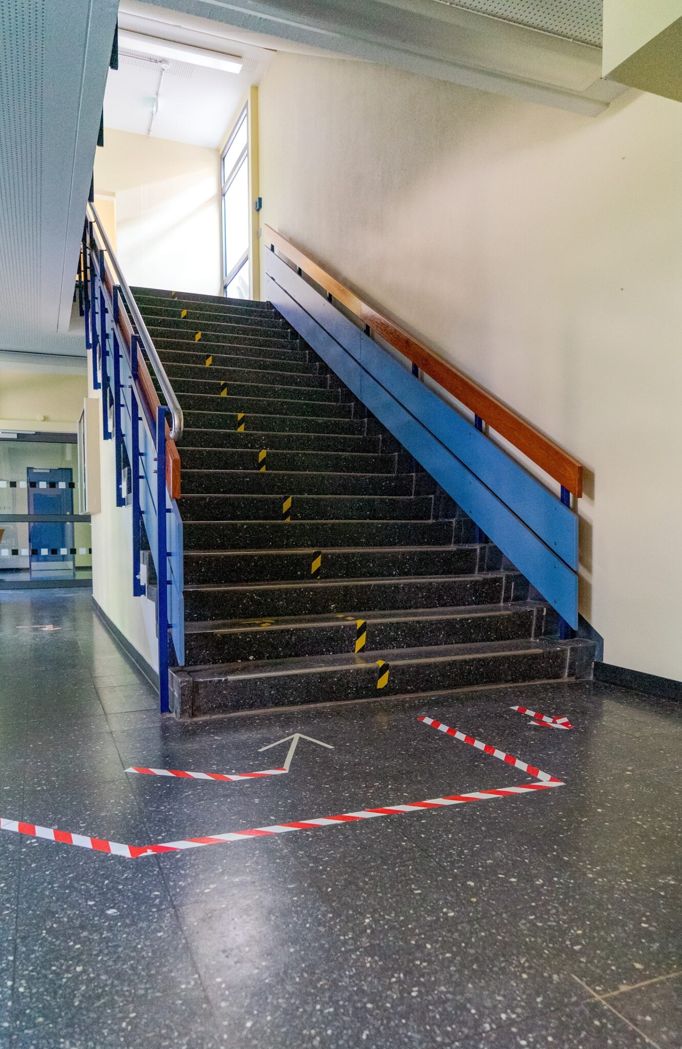 In den diversen Gebäuden wurden sichtbare Markieren auf den Boden (Pfeile, Abgrenzungen etc.) angebracht, damit der Abstand von 1,5m eingehalten wurde und die Schülerinnen und Schüler nur eine Richtung im Treppenhaus/auf den Fluren nutzten.