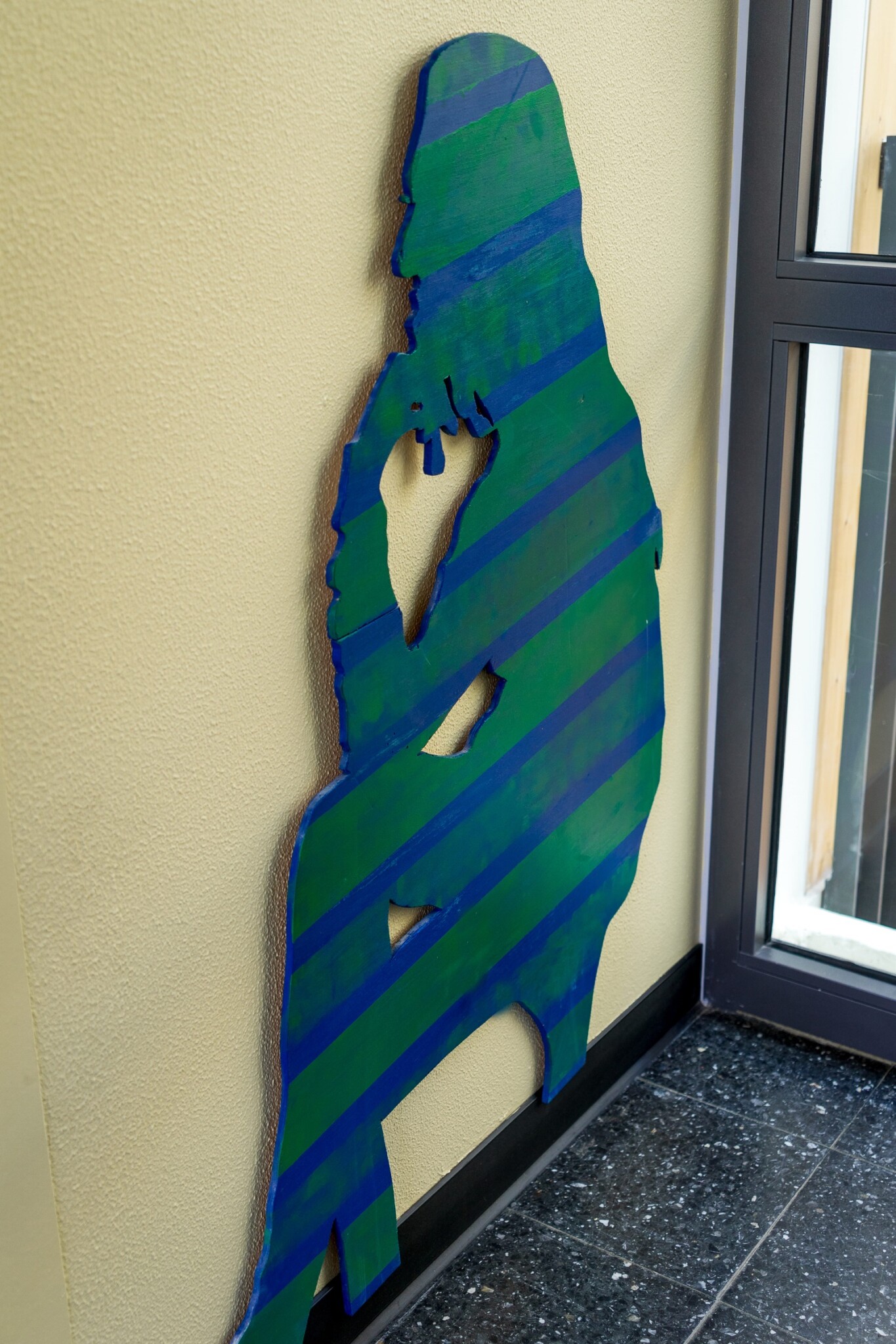 Im Gebäude H1 standen Holzfiguren, die nun, nachdem die Wände fertig gestrichen wurden, wieder aufgehängt sind.