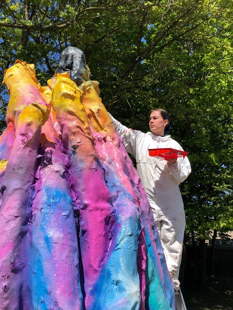 „Gemeinsam zu gestalten, zu singen, zu tanzen, Musik zu hören, zu sprayen hat mir viel gegeben. Sprayen war der technisch coolste Teil des Projekts. Es war außergewöhnlich nach dem Unterricht im Kunstraum und auf dem Schulgelände sogar bis in die Nacht zu arbeiten. Von der Idee zum fertigen Resultat war ein spannender Prozess. Wir haben ein einhalb Wochen an der Statue gearbeitet und 68 Stunden investiert. Menschlich hat es großen Spaß gemacht mit der Gruppe zu arbeiten. Ich würde das Projekt jederzeit wiederholen.“ Maya, 18