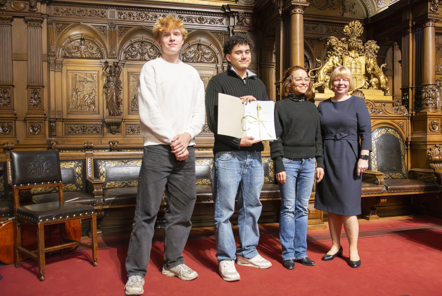 In Hamburg werden alle Schüler*innen, die einen ersten Preis in einem Wettbewerb auf Hamburg-Ebene gewonnen und/oder auf Bundesebene hervorragende Leistungen gezeigt haben, zum Wettbewerbsfest im Hamburger Rathaus eingeladen. Meo Kieme und Evan Sanchez haben die Ehrung für die Klasse wahrgenommen und bekamen in einer feierlichen Zeremonie von Katharina von Fintel, Staatsrätin der Behörde für Schule, Familie und Berufsbildung, Ehrenurkunden überreicht.